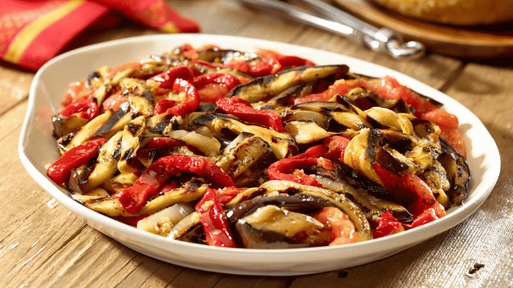 - Rociamos las berenjenas y los pimientos con un poco de aceite de oliva. Introducimos todos los ingredientes en el recipiente.