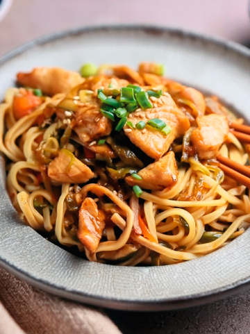 El pollo yakisoba es una receta japonesa muy popular, ideal para probar la gastronomía de otro lugar desde casa; las cantidades de esta receta están pensadas para 4 personas y combinan fideos, verduras y pollo en un plato completo, rápido y lleno de sabor oriental.