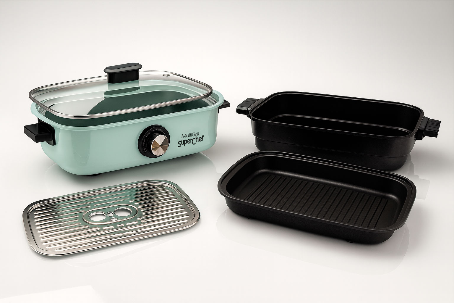 Incluye diferentes accesorios: cazuela para guisos, bandeja para vapor, parrill/grill, tapa de cristal.